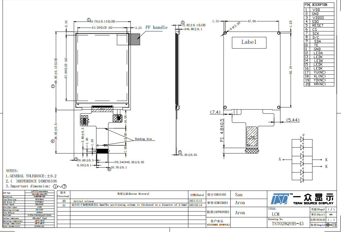 Este módulo de exibição é um TFT (Thin Film Transistor) de matriz ativa colorida do tipo transmissivo display de cristal líquido (LCD). Este módulo é composto por um módulo TFT LCD, um circuito driver e uma unidade de luz de fundo. A resolução de um 2.8 "contém 320*240 pontos e o Área ativa é 43,2 (L) x 57,6 (A)